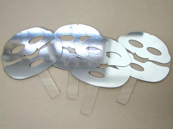 The brief was to come up with some hand-held face-covering mask-type things to promote a foil-based face-care product from Esteé Lauder. We had initially expected to laser-cut 4mm acrylic, then some thin aluminium foil, then bond together. Bear in mind this was all a very last-minute request, phoned-in on a Friday evening, then started and completed next day, Saturday... .