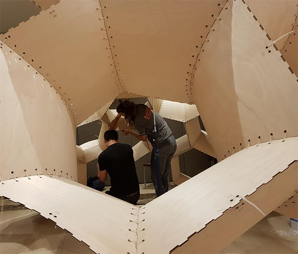 We worked with renowned engineering firm Eckersley O'Callaghan to cut a number of thin plywood pieces we then sent to Barcelona so they could be put together to make a modular pavilion prototype.