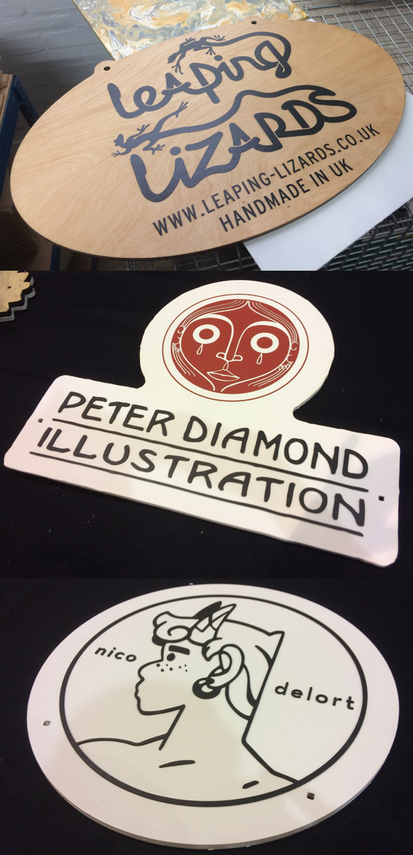Signage for Leaping Lizards (cut, stained, etched, varnished for outdoor use), Peter Diamond (mix of cut MDF and card, for indoor use) and Nicolas Delort (various types of cut MDF, for indoor use)